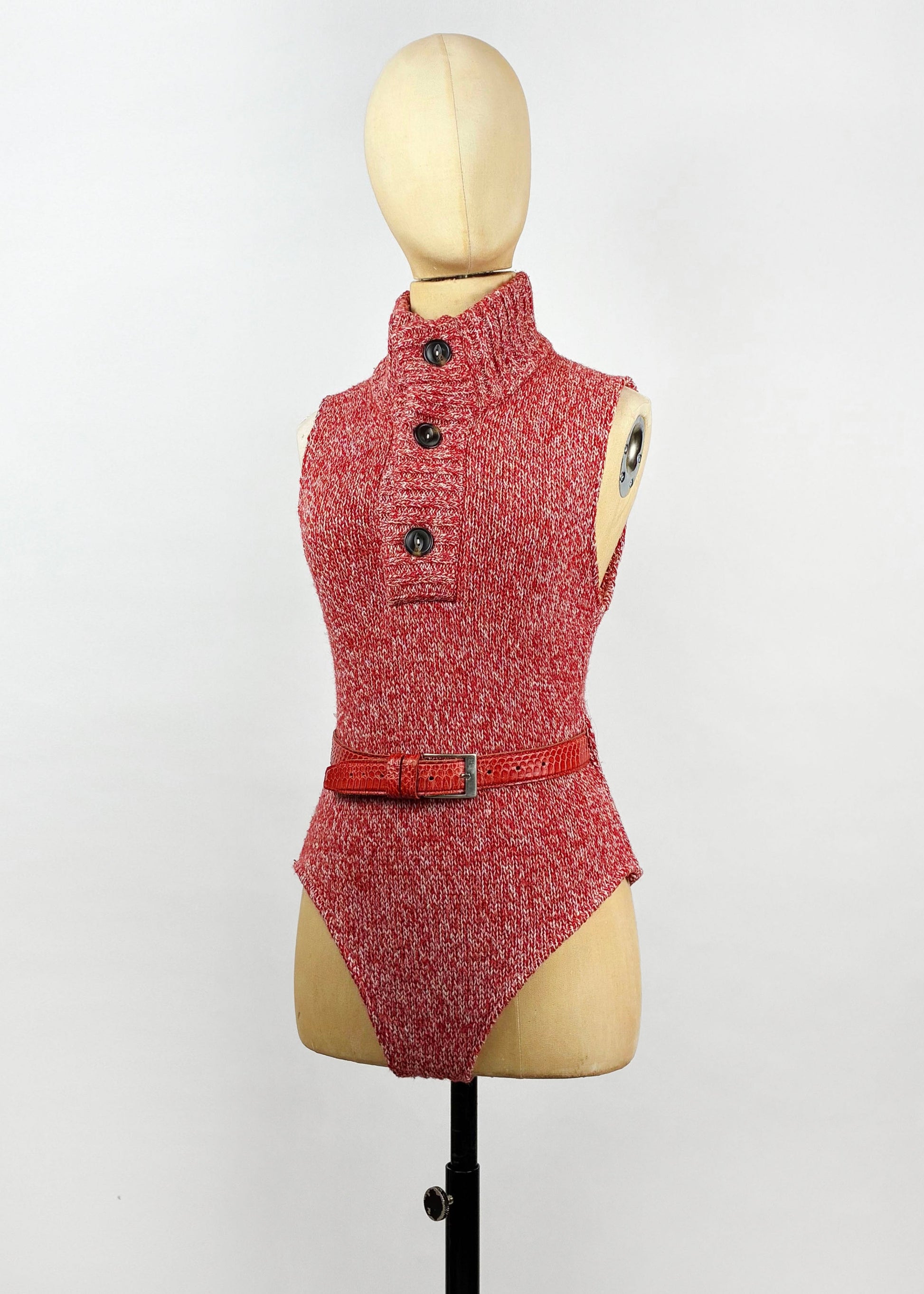 Finished with a red, snake-style belt that wraps the waist and adds a subtle sense of movement and edge to the silhouette.